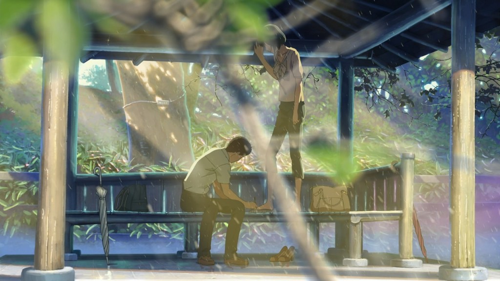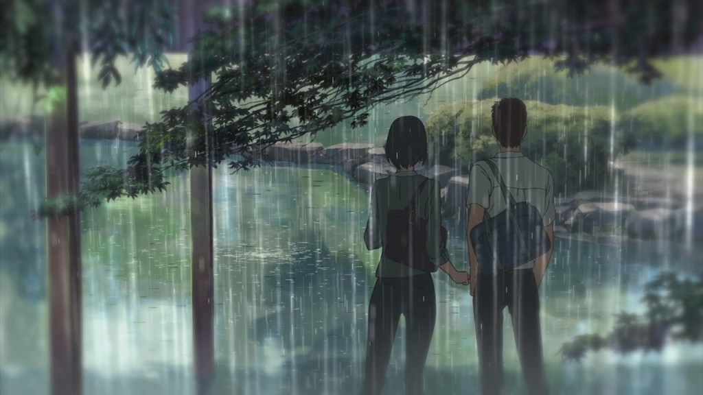 Những cơn mưa trong The Garden of Words hiện lên thật đẹp, thật thơ, và cũng thật ý nghĩa. Mưa là điều kiện, là cơ duyên để Takao và Yukino gặp nhau, đồng thời, mưa cũng như tấm màn bảo vệ, ngăn cách họ khỏi những lo toan, phán xét của người đời, cho họ chút không gian riêng để tâm hồn được chữa lành. Để rồi không biết từ bao giờ, cả hai đều ngóng chờ cơn mưa tới, ngóng chờ cơ hội để được gặp nhau tại Khu vườn ngôn từ, nơi họ được sống đúng với mong muốn của chính mình.