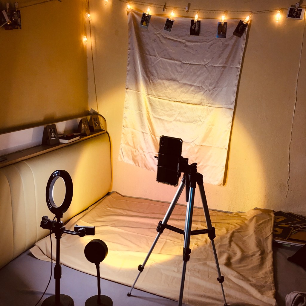 “Studio” của mình thì đơn giản lắm. Một chiếc điện thoại thông minh, một tripod. Hai thứ cơ bản nhất để tự set được góc máy chụp. Các đạo cụ khác thì tuỳ ý tưởng và concept mà mình sẽ bổ sung, và tất cả đều có thể tìm mua trên Shopee với mức giá rất rẻ. Những món đồ mình hay dùng nhất gồm có: 1 đèn sunset, 1 đèn livestream có ánh sáng mạnh, vải trơn để làm background khi cần. Chỉ vậy thôi! Set up đèn, tripod, bật cam trước của điện thoại lên, set chế độ hẹn giờ, ngồi vào vị trí và căn chỉnh góc chụp, và tadaa – Tự mình đã có thể thực hiện một bộ ảnh cá nhân theo ý thích mà không cần đi đâu hết!